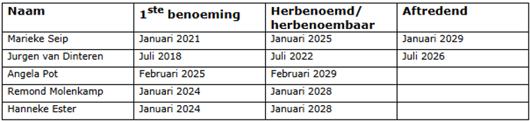 Volgens de Governancecode is de maximale zittingsduur 8 jaar. Onderstaand rooster geeft aan wanneer de leden aftreden.